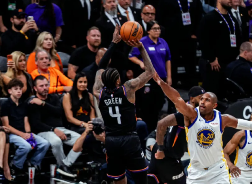 即便如此,勇士队还是在今天的比赛里竭尽全力,奈何太阳队的球员比较年轻,活力十足,拳怕少壮啊。平心而论,布克和狄龙-布鲁克斯的表现都不理想,命中率很低,但是太阳队还有个更加年轻的得分手,就是杰伦-格林。