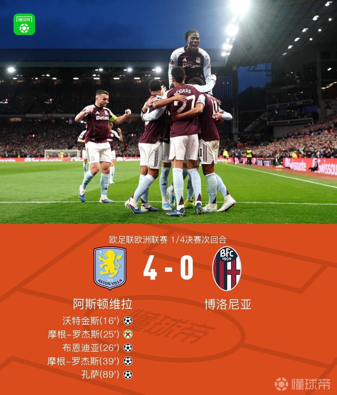 北京时间4月17日欧足联欧洲联赛 1/4决赛次回合,阿斯顿维拉对阵博洛尼亚。上半场沃特金斯首开记录,罗杰斯失点,布恩迪亚破门再下一城,罗杰斯将功补过破门扩大比分。下半场孔萨破门锁定胜局。最终比分阿斯顿维拉 4-0 博洛尼亚。两回合总比分阿斯顿维拉7-1博洛尼亚晋级。